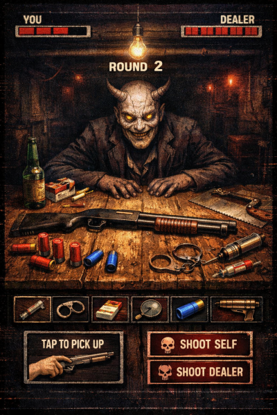 Система предметов. В ходе партии вы получаете доступ к различным предметам: лупа позволяет подсмотреть тип патрона в патроннике, наручники пропускают ход противника, сигареты восстанавливают здоровье, ножовка увеличивает урон следующего выстрела вдвое. Грамотное использование инвентаря — ключ к победе.